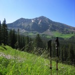 The next morning was much drier, so before long we were at the intersection of the Dark Canyon trail & the Silver Basin Trail. We were planning to head up silver basin trail to our base camp at the bottom of Oh Be Joyful Pass (OBJ) trail. Fortunately we picked up the Trails Illustrated map (Kebler Pass/Paonia Reservoir #133) that pointed out the fact that our original base camp was no where near water, so we decided to continue up Oh Be Joyful Pass trail to find a good spot. ~|~[caption id="attachment_741" align="alignleft" width="150" caption="Heading up the trail"]